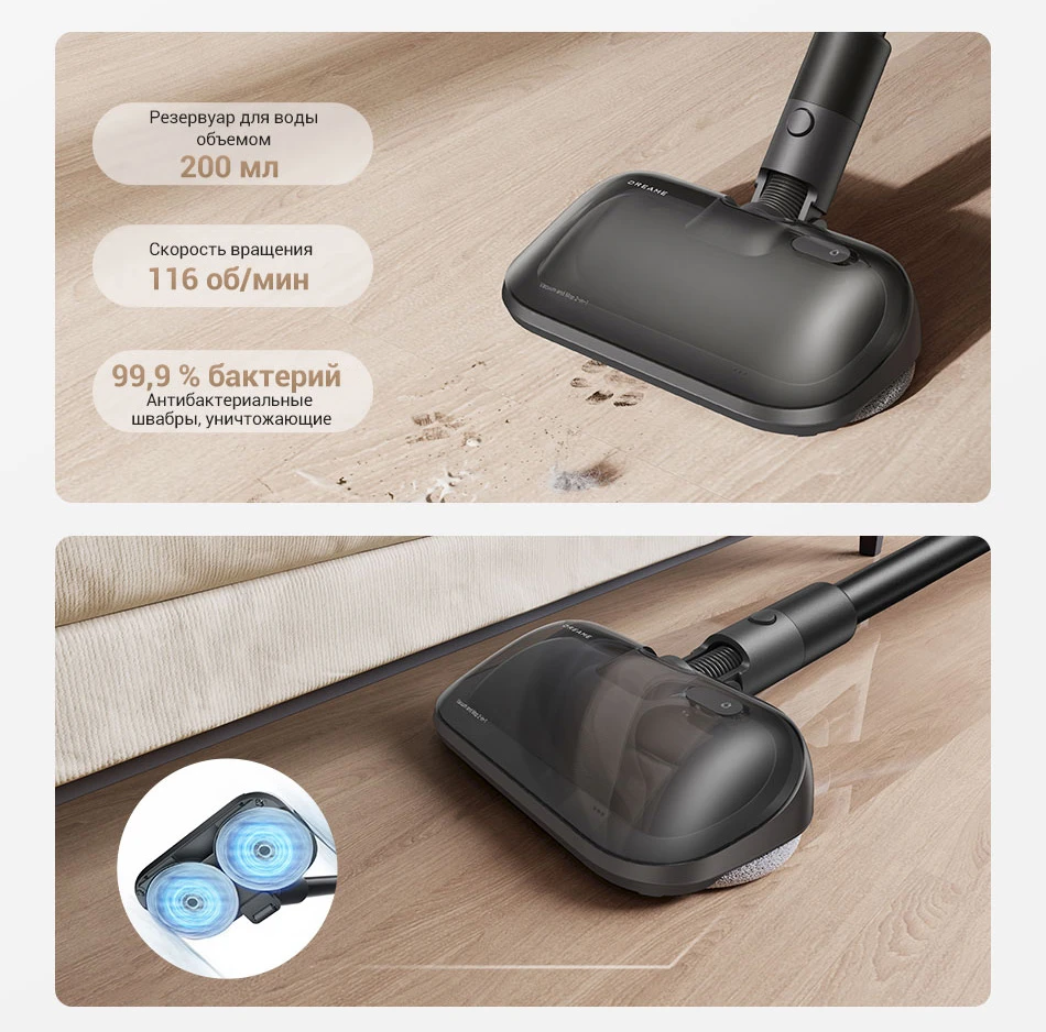 Создавайте идеальную чистоту благодаря сочетанию функций сухой и влажной уборки. Такой динамичный подход обеспечивает надежное удаление грязи, пыли и копоти и создает комфортную здоровую обстановку.