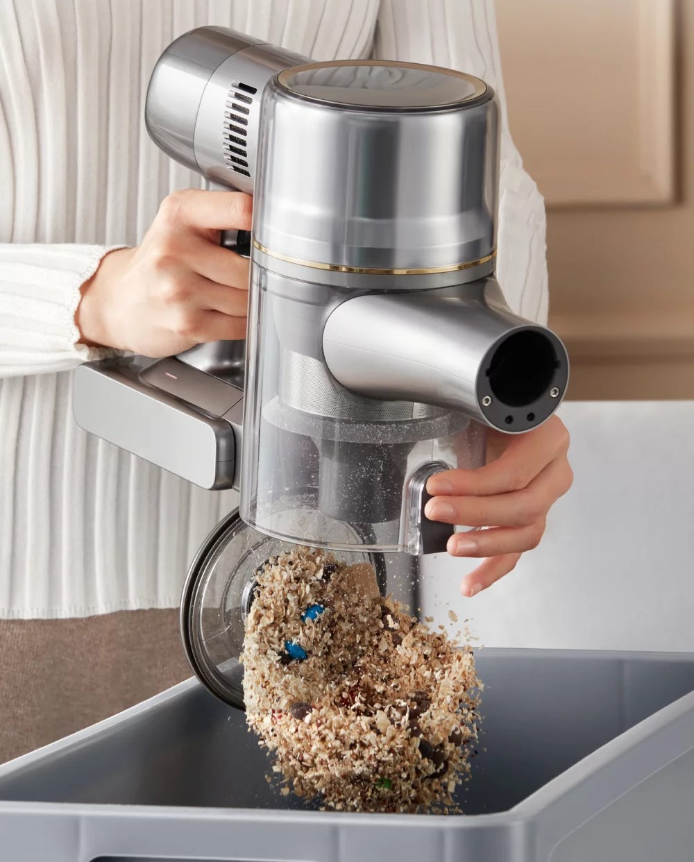 Контейнер для сбора пыли легко опорожняется одним нажатием, что обеспечивает удаление собранного мусора за считанные секунды. Благодаря вместительному пылесборнику объемом 0,6 л уменьшается количество вынужденных пауз в работе из-за необходимости частого удаления пыли, значительно улучшая эффективность уборки.