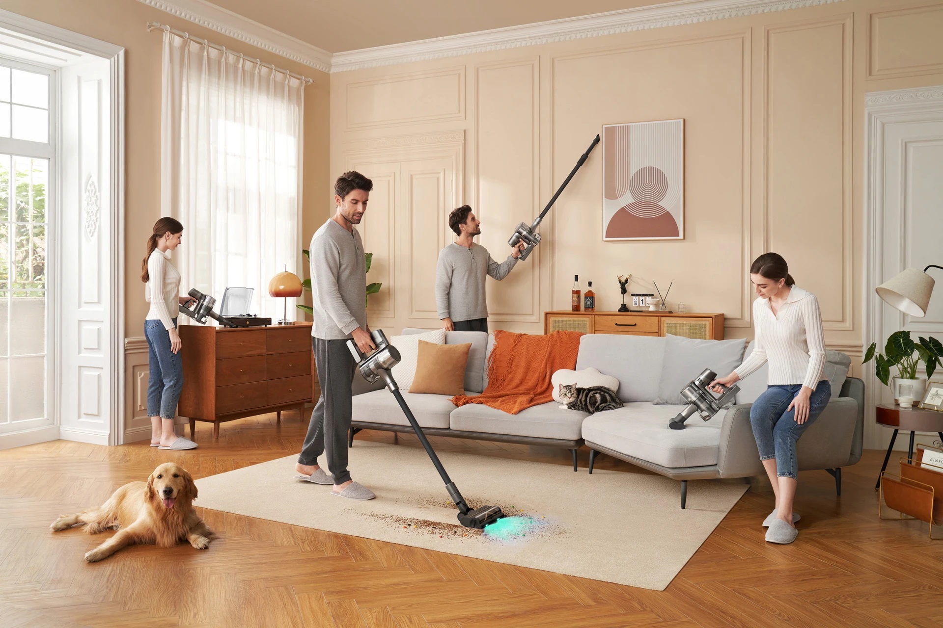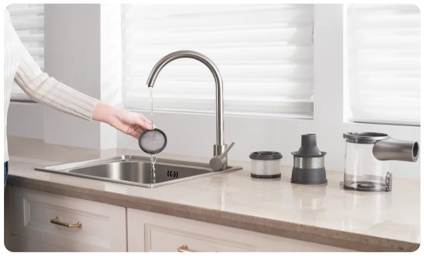 Многофункциональная роликовая щетка с подсветкой, фильтр HEPA, а также пылесборник и насадки для швабры сконструированы таким образом, чтобы их можно было снимать и мыть.