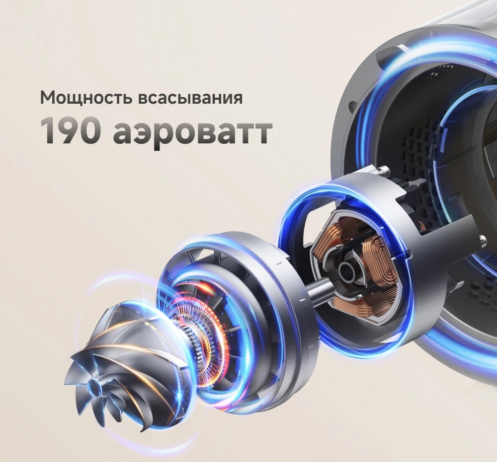 Высокоскоростной бесщеточный двигатель обеспечивает мощность всасывания 190 аэроватт (27000 Па), что позволяет без труда убирать волосы, грязь, пыль и мусор. Мощный двигатель гарантирует более длительный срок службы и улучшенную эффективность очистки, упрощая вашу уборку.
