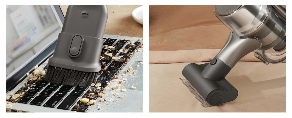 Расширенные возможности уборки с помощью многофункциональных насадок уже здесь. Комбинированная насадка позволяет чистить углы и узкие места, а широкая комбинированная насадка справляется с загрязнениями на столах, окнах и дверях, обеспечивая удобство и эффективность уборки.